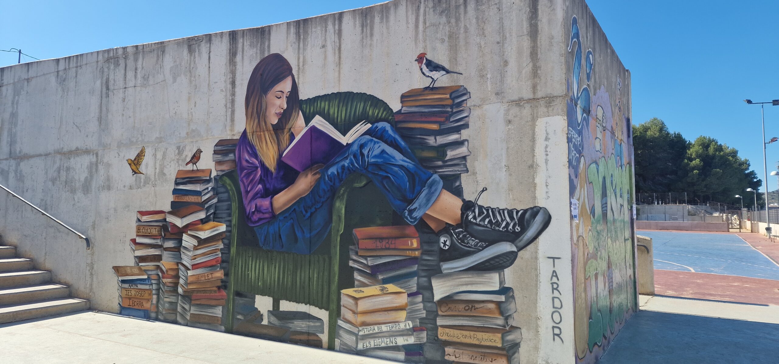 At the Secondary School of Benissa, I made a mural project designed to inspire students and promote positive values within the school. The mural depicts a young girl sitting on a sofa while reading, surrounded by a set of books with titles of universal classics. This composition takes the students to a quiet, reflective and creative space, where reading, knowledge and curiosity take center stage.