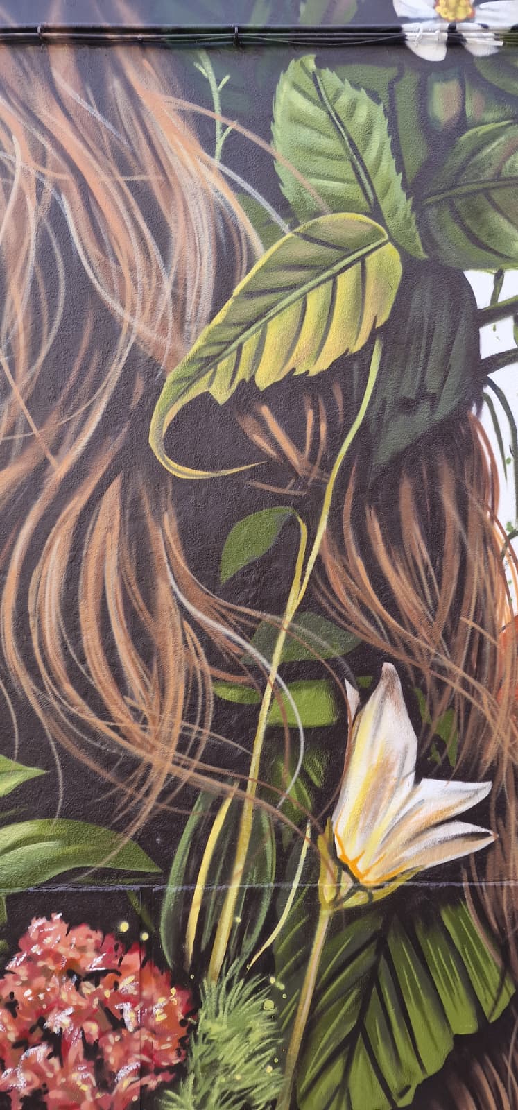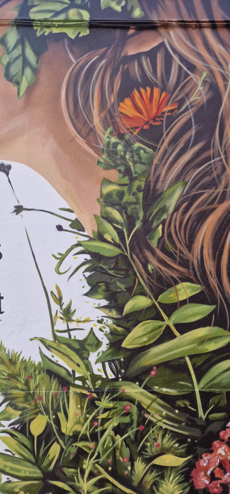The mural depicts a large-format female figure integrated with elements of the native flora -leaves, plants and flowers- that characterize the natural landscape of the Marina Alta. The work is conceived as a tribute to nature and its preservation, inviting viewers to reflect on the value of what surrounds us and the need to take care of it for future generations. El Mirall de La Marina
