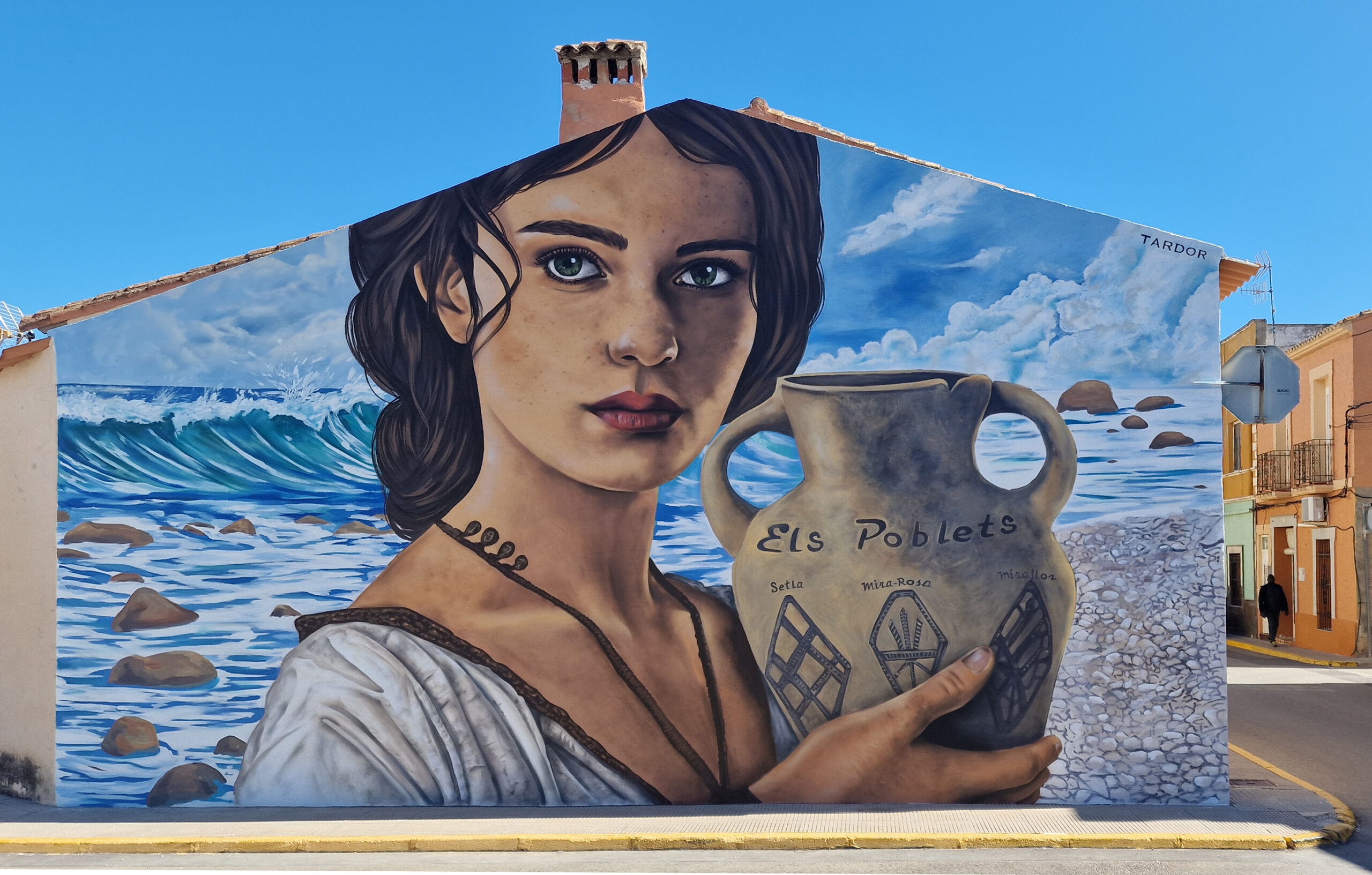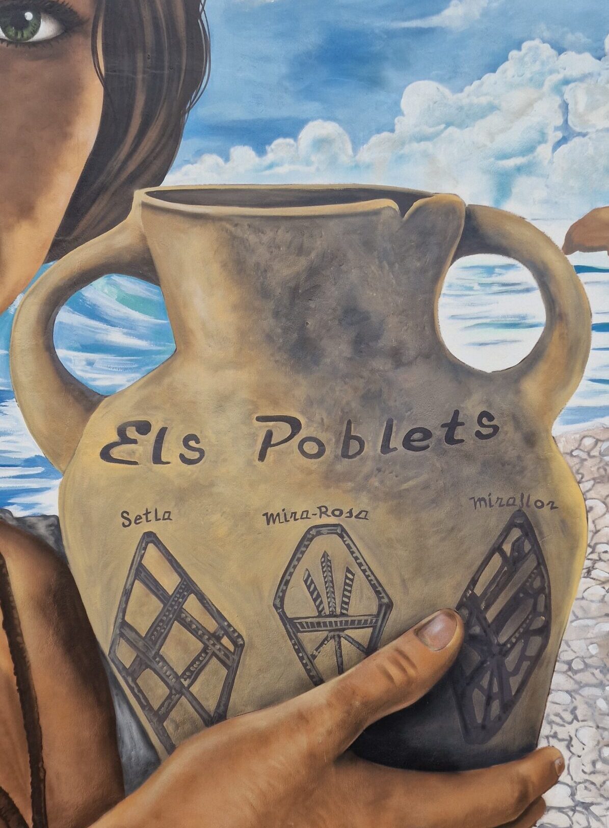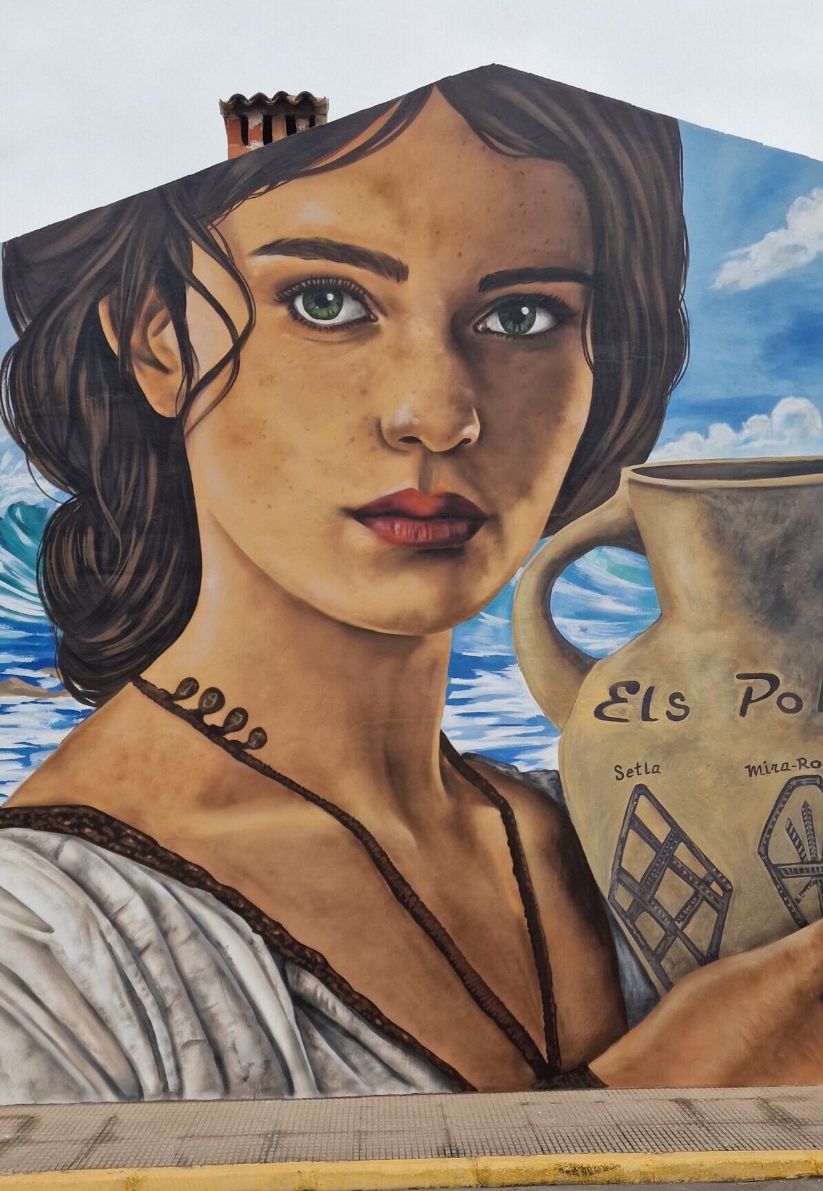 Para esta obra, desarrollé una composición centrada en la figura de una mujer romana sosteniendo un ánfora, representada con un estilo figurativo naturalista que mantiene mi sello personal. La elección del ánfora no es casual: simboliza la vida cotidiana, el comercio marítimo y la conexión del pueblo con el Mediterráneo desde tiempos antiguos. La figura está acompañada por un fondo en el que aparece la playa de la Almadrava, fundiendo paisaje, historia y arte urbano en un solo mural.