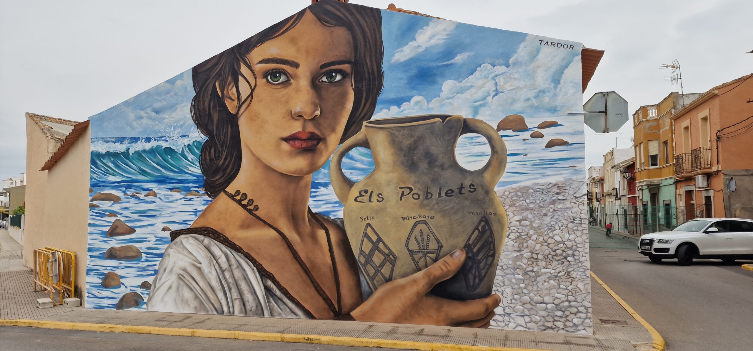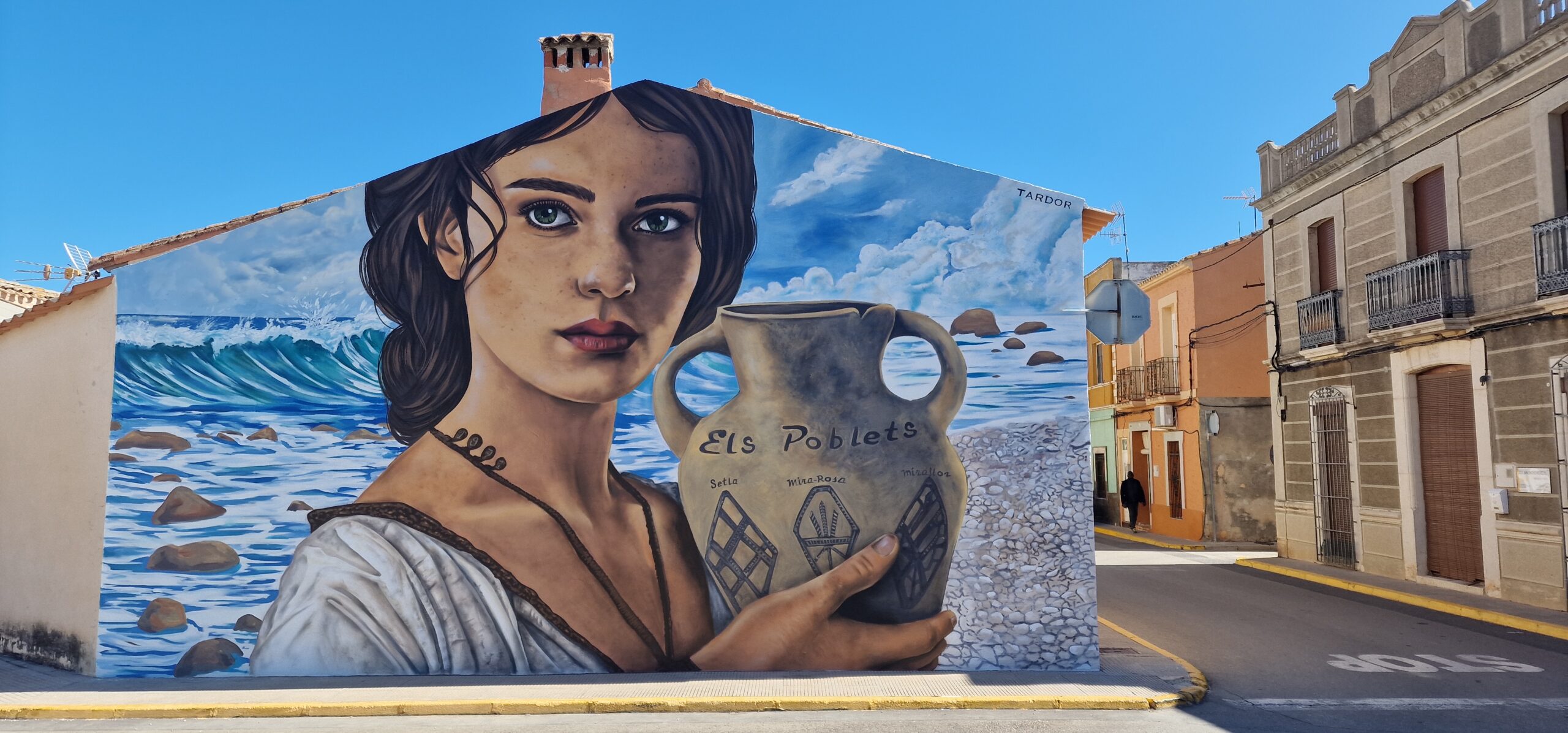 El mural que realicé en Els Poblets (Alicante) es una de esas intervenciones artísticas en las que el arte urbano se convierte en una herramienta para conectar la memoria histórica del municipio con su identidad contemporánea. Este proyecto surge para poner en valor uno de los elementos patrimoniales más importantes de la zona: los restos romanos encontrados en la playa de la Almadrava, un enclave arqueológico que forma parte del pasado mediterráneo de la Marina Alta.